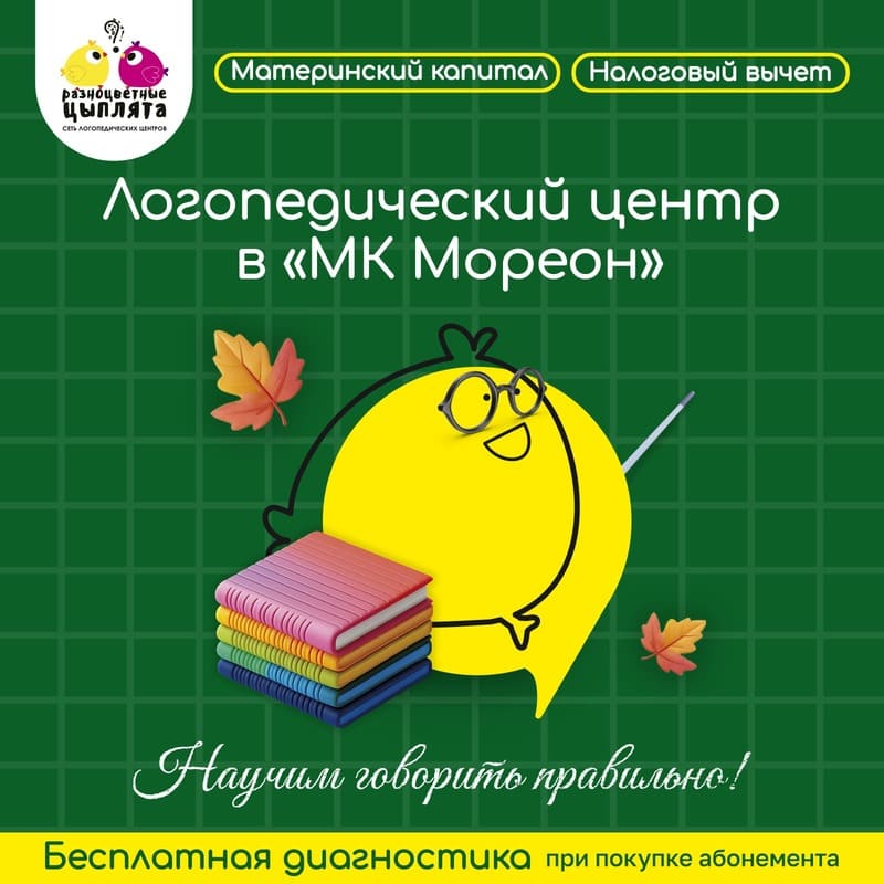 Дорогие родители! Приглашаем вас и ваших детей в наш Логопедический центр “Разноцветные цыплята” в детском центре "Мореон", где мы будем развивать речь и коммуникативные навыки в увлекательной и игровой форме!Наши преимущества:
